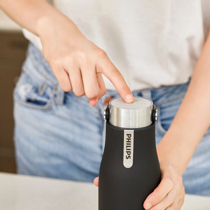 Със самопочистващата се бутилка на Philips нямате нужда от допълнителни филтри. Бутилката се зарежда в електрическа мрежа и пречиства водата с натискането на бутон. Пречистването е еквивалентно на това да преварите вода в рамките на 10 минути.